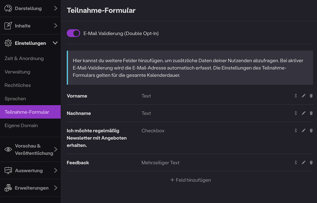 - Öffne im Kalender-Menü Einstellungen → Teilnahme-Formular