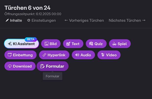 Nutze die Möglichkeiten des Formular-Editors und gestalte deinen Türchen-Kalender so effizient wie möglich. Viel Erfolg!
