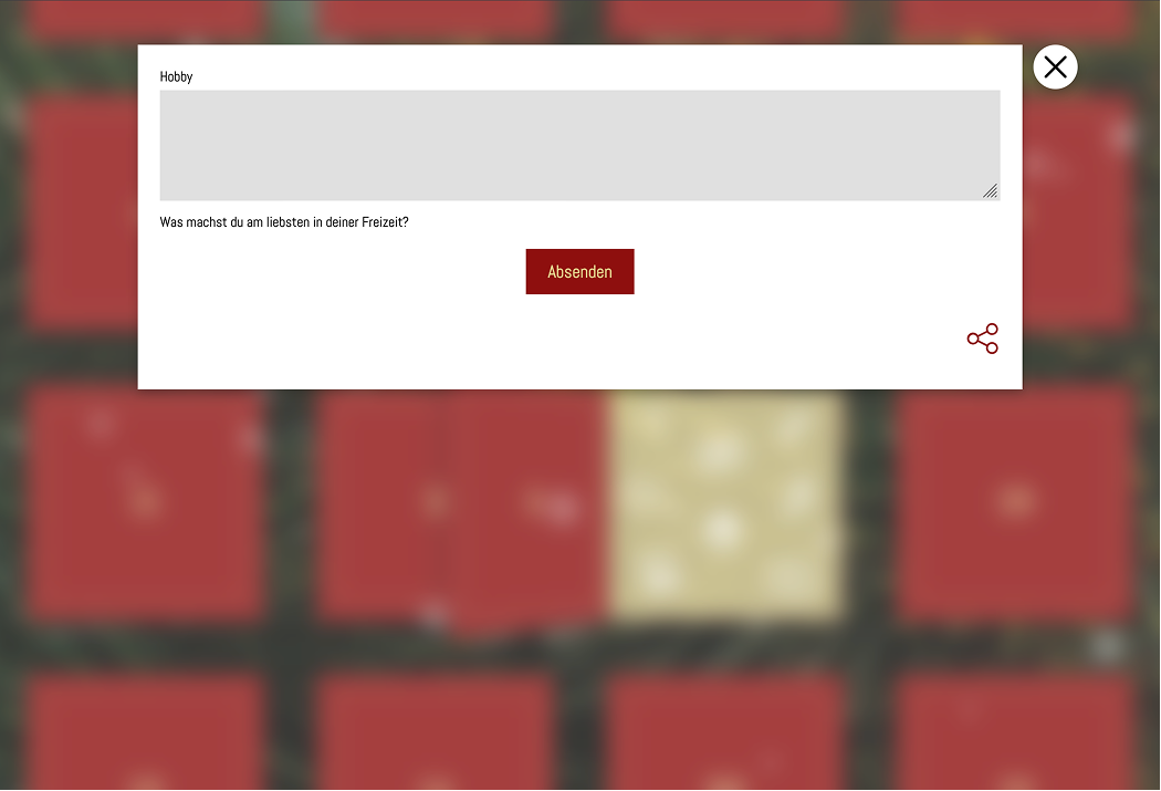 Ein Formular bei Türchen dient dazu Daten von Nutzenden zu erfassen. Dies kann so einfach sein wie die Eingabe einer E-Mail-Adresse (z.B. bei Gewinnspielen) oder komplexere Anforderungen wie die Abfrage von Umfragen, Meinungen oder Einverständniserklärungen.