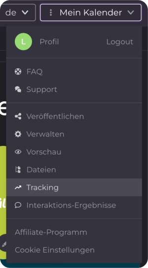 Um dein Tracking-Dashboard zu öffnen, gehe zum 'Mein Kalender'-Menü im Türchen-Editor. Dort findest du eine Übersicht über alle wichtigen Tracking-Daten deines Kalenders. Mit diesem Dashboard kannst du den Erfolg deiner Inhalte detailliert analysieren und die einzelne Türchen oder Events im Blick behalten.