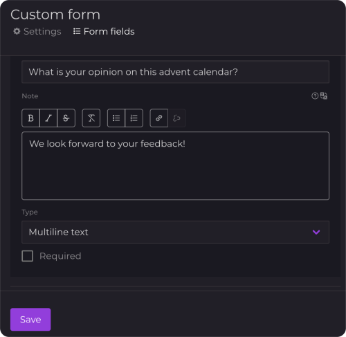 In this article, you'll learn about the different types of forms, their uses, and how to set them up in your Türchen calendar.